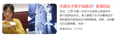 有網(wǎng)友提出疑問,這是同一個(gè)人嗎?衣服怎么會變沒了,或者說黑褲子變成了肉色的?隨后姑娘的親屬表示:“衣著是沒有問題的,監(jiān)控顯示的那一塊很黑,她彎著腰,紫外線照著她,把上衣和褲子都照成了白色” 。